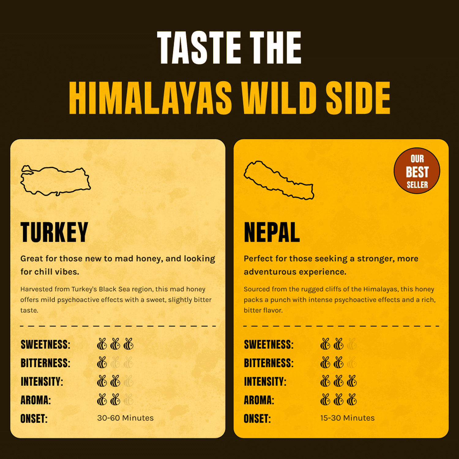 Avec Real Mad Honey, tu as plus de variété que les autres marques. Pensez à cela comme entrer dans un café à Amsterdam. Tu es gâté par le choix. Nous sommes la seule entreprise qui vend à la fois du turc et du népalais mad honey.