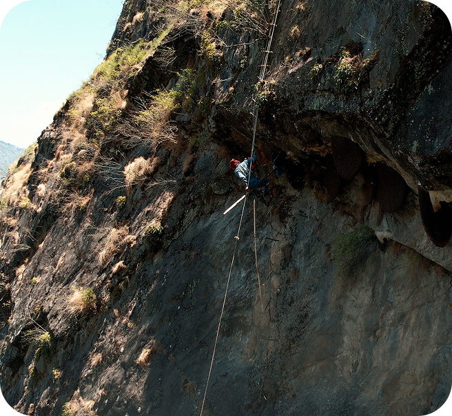 Traditional honey hunting in the Himalayas is dangerous by nature — steep drops, unstable rock, unpredictable weather, and hours suspended on ropes. In the past, hunters often relied on handmade ropes, with no protective clothing, no harnesses, and no real safety gear. Every season came with real risk.